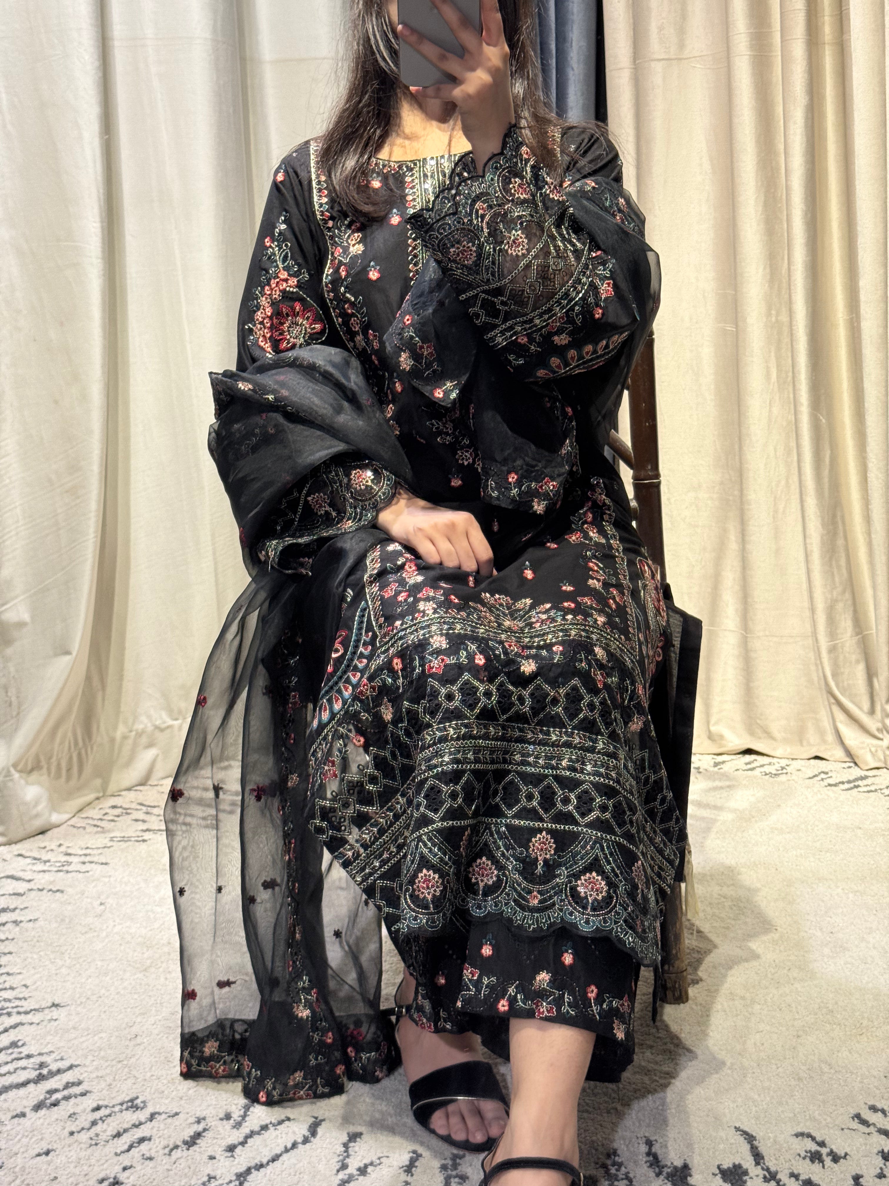 Timeless Black: Embroidered Lawn-Cotton Suit for Everyday Grace